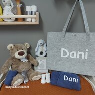 Op zoek naar een uniek en persoonlijk kraamkado voor een jongen of meisje. Dan is deze mooie vilten tas een leuk baby cadeau om te geven en om te krijgen. De babytas is gevuld met verschillende babyartikelen waarbij de naam van de baby op de badcape of badjasje wordt geborduurd.