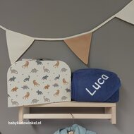Op zoek naar een bijzonder cadeau voor een pasgeborene? Dit schattige koffertje met een vrolijk thema genaamd Roarsome van Jollein is werkelijk prachtig. Het mooie dino printje zal zeker de aandacht trekken in de babykamer. Maar dat is nog niet alles! Je kunt namelijk ook de naam van de baby op de binnenkant van het koffertje schrijven. Zo wordt het echt een uniek en persoonlijk geschenk, vooral in combinatie met de badjas met naam.