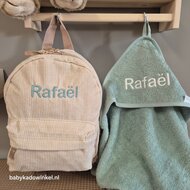 De rugtas is gemaakt van trendy ribstof in de kleur cream en wordt gepersonaliseerd met de naam van de baby op de voorkant. Extra bijzonder: de badcape of het badjasje kan ook worden voorzien van een mooie naamborduring, perfect afgestemd op jouw wensen.