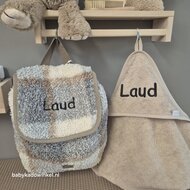 Mooie rugtas met naam geborduurd. Mooi klein formaat. Leuk als geboortecadeau met een mooie badcape of badjas in de tas. De ouders kunnen de rugtas met naam van de baby gebruiken voor het opbergen van klein speelgoed, als logeertas naar opa en oma, voor kinderdagverblijf, peuterspeelzaal enzovoort. Deze rugtas wordt geborduurd met naam van de baby op de voorkant. Kleur borduring naam rugtasje mogelijk in meerdere kleuren, maak uw keuze bij de opties. De breedte van de naamborduring is ca 9 cm. Hoe gaaf is dit stoere bouclé rugzakje? De koele tintjes in de bouclé check print zijn helemaal on-trend deze winter en de biscuit kleur in de hengsels maakt het tasje helemaal af. Met het koordje kun je de tas veilig aflsuiten. Hier zie je jouw mini toch gewoon mee shinen?