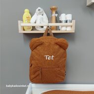 Mooi formaat rugtas. Handig voor kinderdagverblijf, peuterspeelzaal, logeerpartijtje enzovoort. Deze rugtas wordt geborduurd met de naam op de voorkant. Kleur borduring naam rugtasje mogelijk in meerdere kleuren, maak uw keuze bij de opties. Als dit geen schattige rugtas is? Die wil de kleine vast overal mee naartoe nemen. Deze rugzak is te leuk! Compact en cute, maar naast dat is hij ook super handig. De schouderbanden zijn verstelbaar waardoor je hem op jouw gewenste hoogte kan dragen. De stof is zacht en voelt stevig aan. Zo kun je er jarenlang mee doen! In het grote hoofdvak kun je een broodtrommel en drinkfles meenemen, in het kleine voorvakje met rits kun je dingen in stoppen die je niet kwijt wil maken. Deze tas is gemaakt van een super zachte teddystof en de 3D oortjes maken hem helemaal af! Afmeting rugtas: 31 x 26 x 9 cm